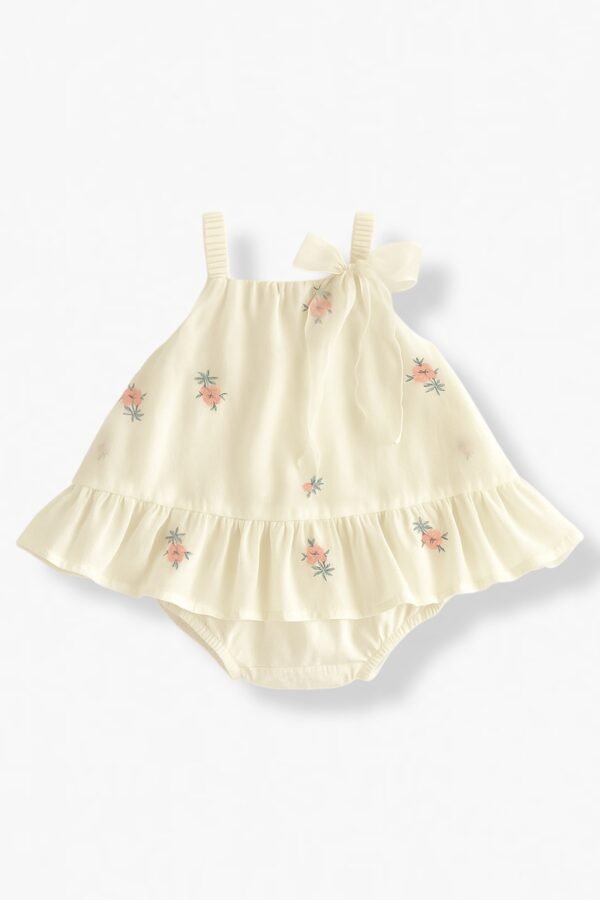 This cute floral dress for newborns comes with an attached romper for added comfort and easy diaper changes. Soft, breathable fabric keeps your baby cozy and stylish. This outfit combines style and practicality in one beautiful piece.