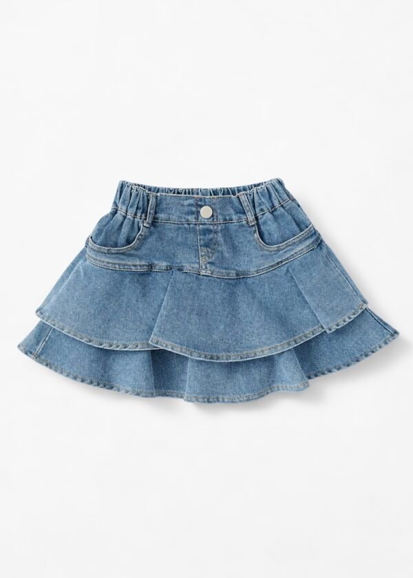 Denim rok met volant. drukknoopsluiting voor en zakken aan de zijkanten en met een geïntegreerde broekje.